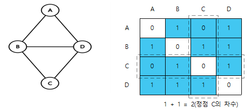 · 임의의 한 정점에서 자기 자신을 가리키는 간선은 없기 때문에 인접 행렬의 대각선은 항상 0입니다.