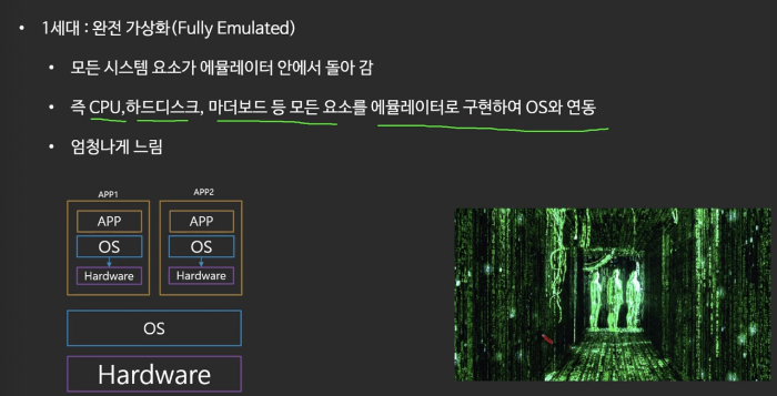 - 2세대 : 하이퍼바이저를 통해 속도가 향상되었다. 하지만 모든걸 하이퍼바이저가 지원하지 않았기에 여전히 빠르진 않았다.