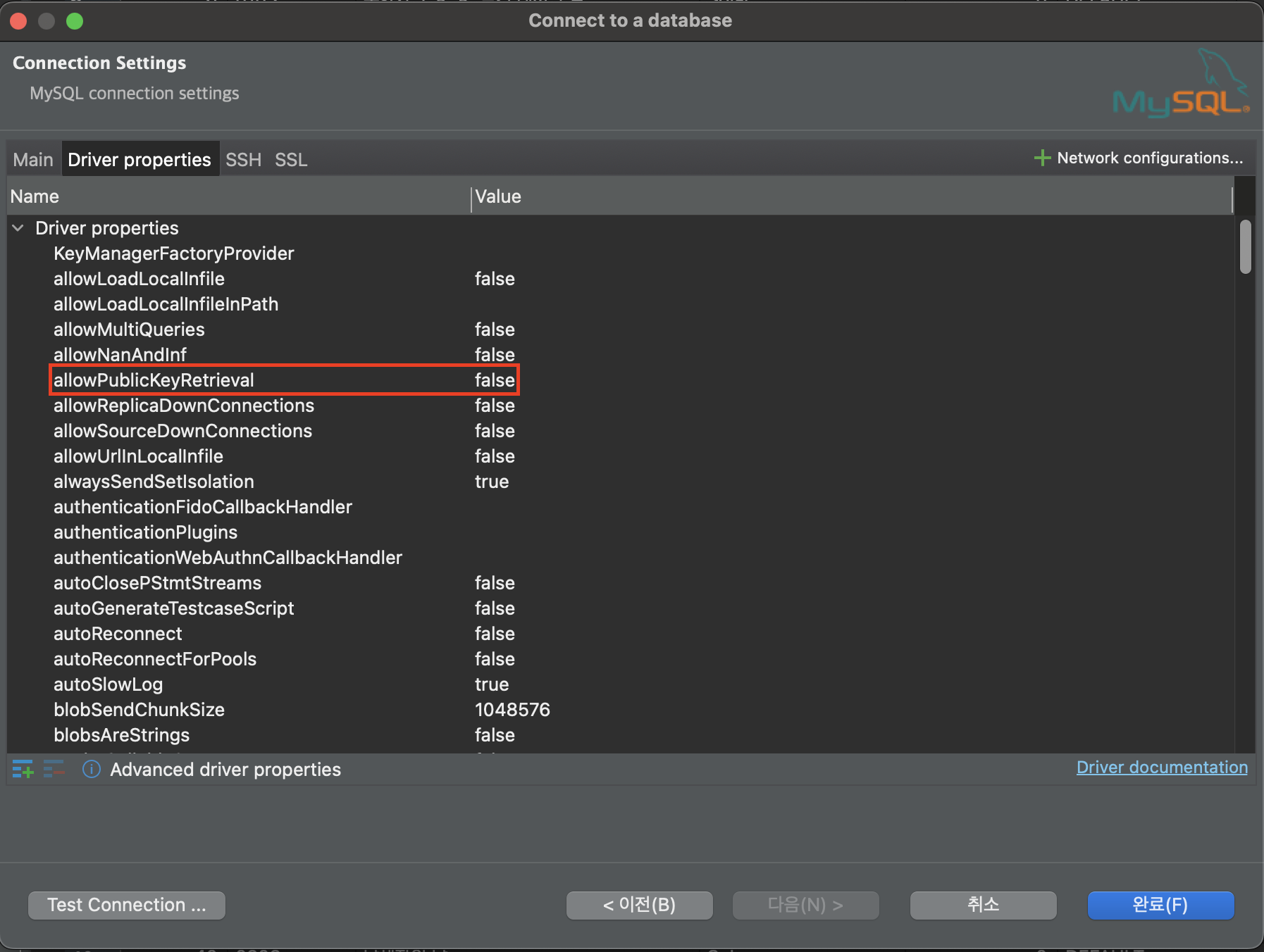 - allowPublicKeyRetrieval가 true로 설정되어 있는지 확인합니다.