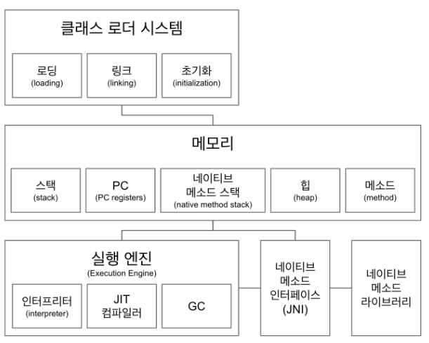 - 운영체제 위에서 동작하는 프로세스로 자바 코드를 컴파일해서 얻은 바이트 코드를 해당 운영체제가 이해할 수 있는 기계어로 바꿔 실생시켜주는 역할을 한다.