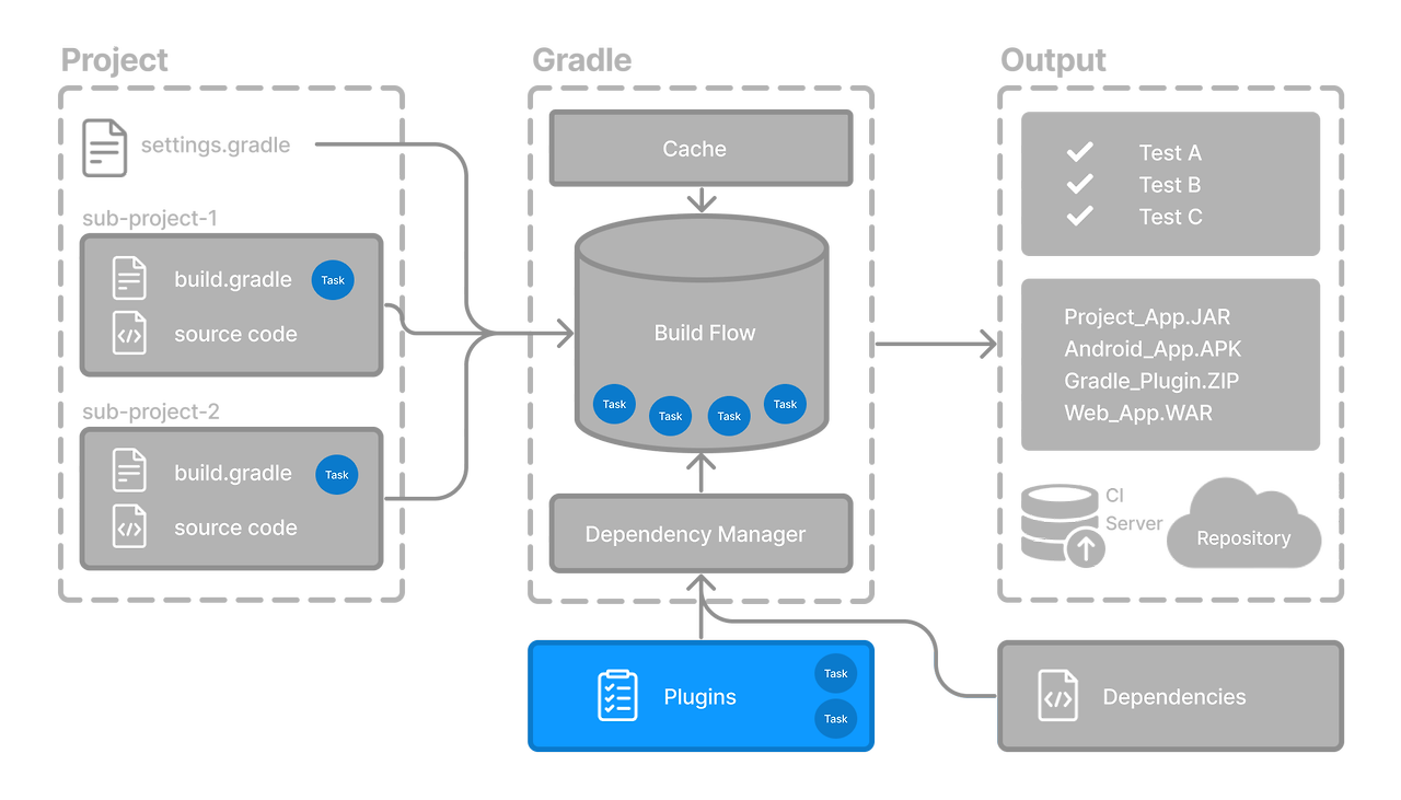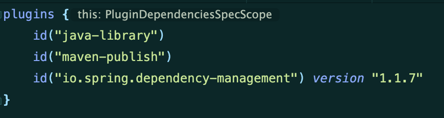 java플러그인, Spring Boot 프로젝트를 지원하는org.springframework.boot플러그인, 또는 Kotlin 개발을 돕는kotlin플러그인 등이 있습니다.