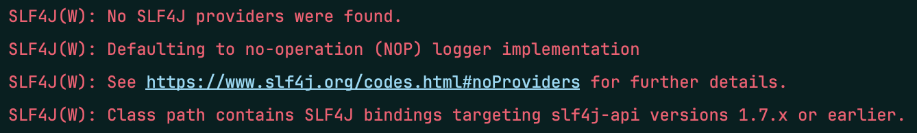 SLF4J(W): No SLF4J providers were found. SLF4J(W): Defaulting to no-operation (NOP) logger implementation SLF4J(W): See https://www.slf4j.org/codes.html#noProviders for further details. SLF4J(W): Class path contains SLF4J bindings targeting slf4j-api versions 1.7.x or earlier. SLF4J(W): Ignoring binding found at [jar:file:/Users/kidd.curious/.gradle/caches/modules-2/files-2.1/ch.qos.logback/logback-classic/1.2.9/7d495522b08a9a66084bf417e70eedf95ef706bc/logback-classic-1.2.9.jar!/org/slf4j/impl/StaticLoggerBinder.class] SLF4J(W): See https://www.slf4j.org/codes.html#ignoredBindings for an explanation. Exception in thread "main" java.lang.IllegalArgumentException: LoggerFactory is not a Logback LoggerContext but Logback is on the classpath. Either remove Logback or the competing implementation (class org.slf4j.helpers.NOPLoggerFactory loaded from file:/Users/kidd.curious/.gradle/caches/modules-2/files-2.1/org.slf4j/slf4j-api/2.0.11/ad96c3f8cf895e696dd35c2bc8e8ebe710be9e6d/slf4j-api-2.0.11.jar). If you are using WebLogic you will need to add 'org.slf4j' to prefer-application-packages in WEB-INF/weblogic.xml: org.slf4j.helpers.NOPLoggerFactory - 기존엔 정상 작동 하던 코드여서.. 더욱 막막했습니다.